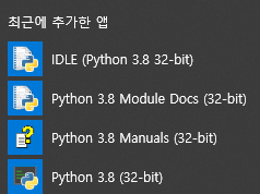 파이썬을 설치하면 바로 실행을 할 수 있다. 시작 메뉴를 눌러서 보면 다음과 같이 설치 되 있을 텐데