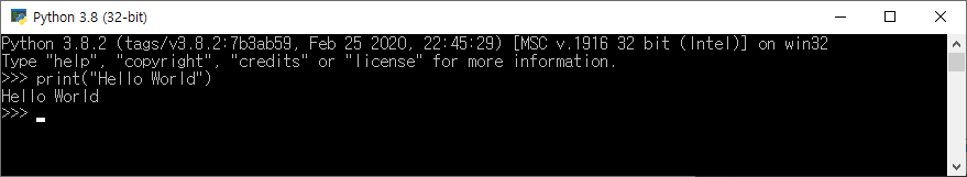이러한 검은화면은 Prompt(프롬프트)라고 불리며 >>>에 코드를 한줄씩 입력하면 됨. 실행결과는 곧바로 볼수 있음.