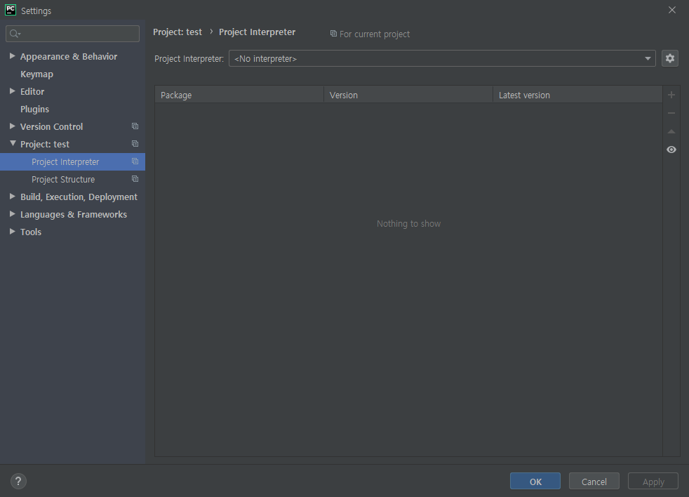 그럼 오른쪽 톱니 모양 누르면 Interpreter 세팅으로 들어가게 되는데