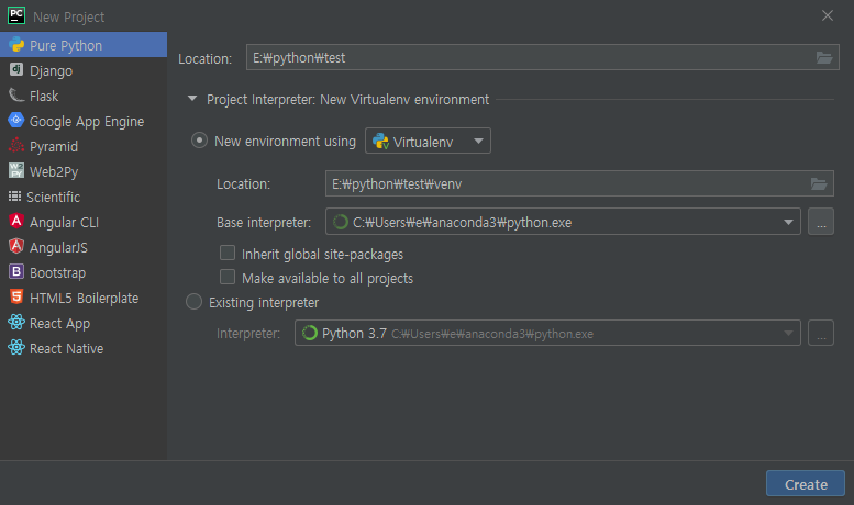 여기서 파일을 저장할 위치('Location')을 정하고 가상환경('Virtualenv')를 정한다.